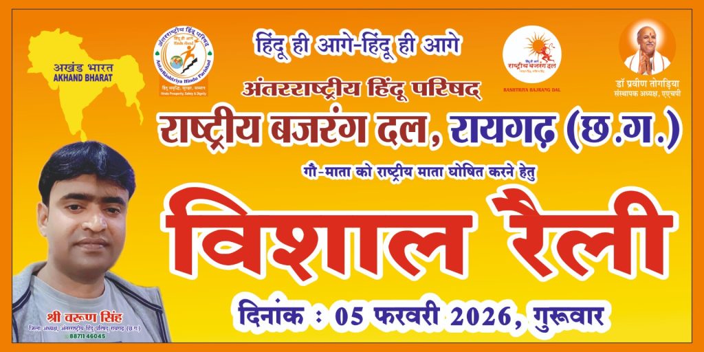 रायगढ़ | 5 फरवरी 2026रायगढ़ शहर में आज अंतर्राष्ट्रीय हिंदू परिषद एवं राष्ट्रीय बजरंग दल के तत्वावधान में गौ माता को राष्ट्र माता घोषित किए जाने की मांग को लेकर एक विशाल रैली का आयोजन किया गया। यह रैली नगर पंचायत परिसर से प्रारंभ होकर शहर के प्रमुख मार्गों से होते हुए पूरे रायगढ़ में गूंजती रही।रैली का मुख्य उद्देश्य भारतीय संस्कृति और सनातन परंपरा की आधारशिला मानी जाने वाली गौ माता को राष्ट्र माता का दर्जा दिलाने की मांग को जन-जन तक पहुंचाना रहा।