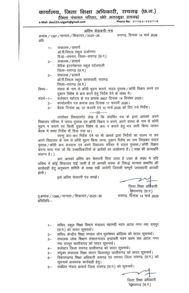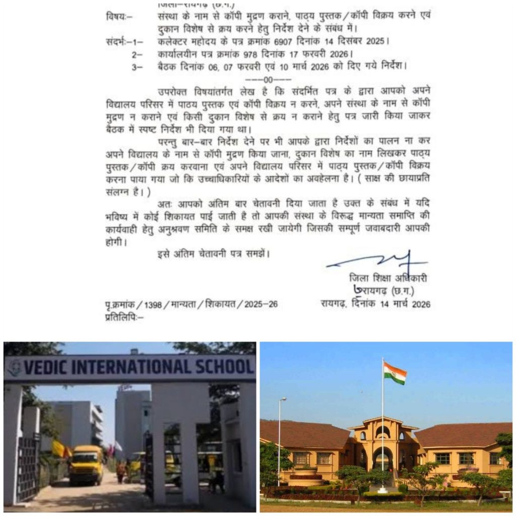 रायगढ़। जिले में निजी स्कूलों द्वारा अभिभावकों पर महंगी किताबें और कॉपियां खरीदने का दबाव बनाने के मामलों पर अब प्रशासन ने सख्त रुख अपना लिया है। लगातार मिल रही शिकायतों और मीडिया में उठे मुद्दों के बाद जिला शिक्षा अधिकारी (डीईओ) ने मामले को गंभीरता से लेते हुए वैदिक और जिंदल स्कूल प्रबंधन को अंतिम चेतावनी पत्र जारी किया है।