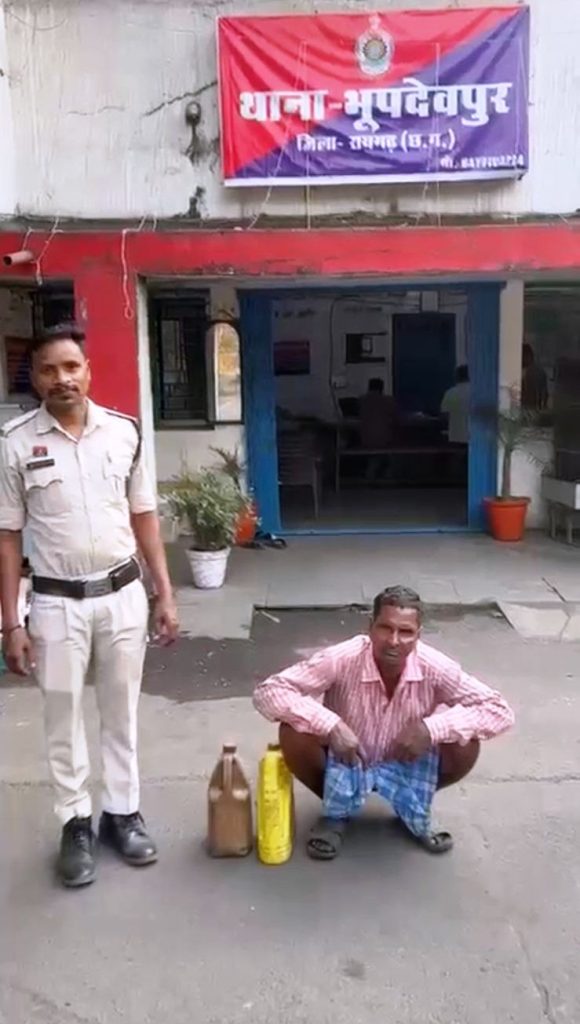 भूपदेवपुर पुलिस ने ग्राम बिंजकोट में दबिश देकर जयनारायण डनसेना (58) के कब्जे से 10 लीटर कच्ची महुआ शराब बरामद की।