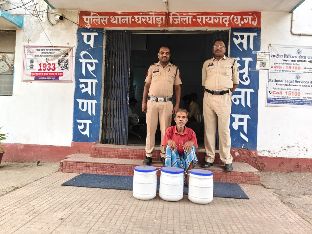 सबसे बड़ी कार्रवाई घरघोड़ा थाना क्षेत्र में हुई, जहां मुखबिर की सूचना पर पुलिस ने ग्राम घरघोड़ी डनसेनापारा में दबिश दी। यहां कन्हैयालाल डनसेना (31) अपने घर के परछी में प्लास्टिक जरीकेनों में कच्ची महुआ शराब रखकर बिक्री कर रहा था। पुलिस ने मौके से 70 लीटर महुआ शराब बरामद कर आरोपी को गिरफ्तार कर लिया।
