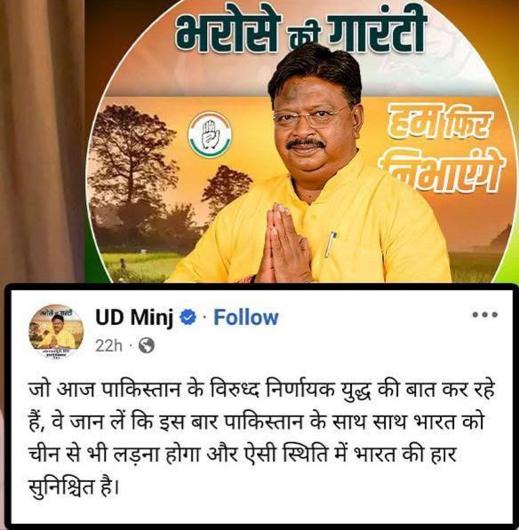 छत्तीसगढ़ के पूर्व विधायक यूडी मिंज का हालिया सोशल मीडिया पोस्ट, जिसमें उन्होंने पाकिस्तान के साथ युद्ध की स्थिति में भारत की हार को सुनिश्चित बताया है, अत्यंत दुर्भाग्यपूर्ण और निंदनीय है। यह न केवल राष्ट्र के गौरव और आत्मसम्मान के विरुद्ध है, बल्कि स्वतंत्र भारत की अस्मिता पर एक खुला प्रहार है। भारत वह भूमि है, जिसने 1965, 1971 और 1999 के युद्धों में अपने अदम्य साहस, वीरता और त्याग से पूरी दुनिया को यह सिखाया है कि हमारा देश न तो दबता है, न टूटता है और न ही पराजय स्वीकार करता है। यूडी मिंज जैसे नेताओं का पराजयवादी वक्तव्य भारतीय सैनिकों के बलिदान का अपमान है और करोड़ों देशवासियों के आत्मबल को चोट पहुँचाने का प्रयास है, जिसे किसी भी दृष्टि से क्षमा नहीं किया जा सकता।