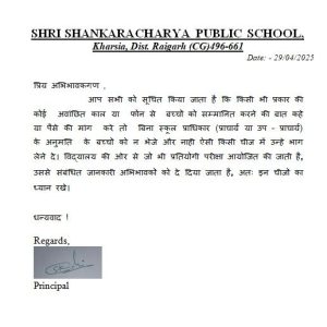 बता दे कि प्रतिष्ठित स्कूल श्री शंकराचार्य पब्लिक स्कूल अच्छी शिक्षा के मामले में नंबर 1 स्कूल है इसलिए स्कूल के नाम से किसी भी ऐसी धोखाधड़ी से बचे। पूजा जायसवाल