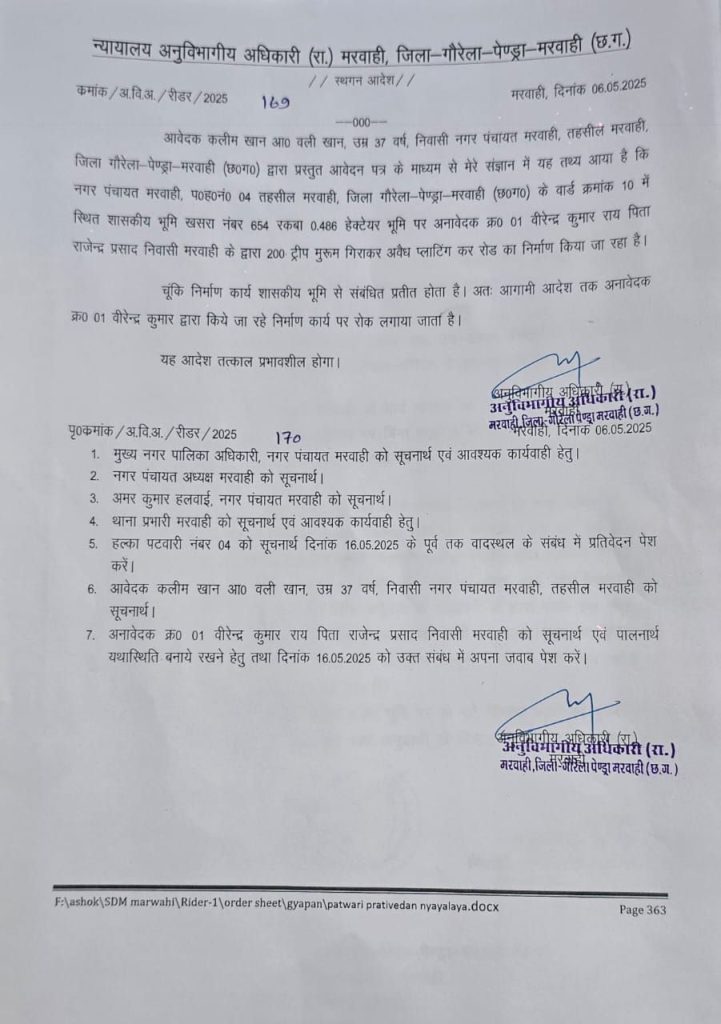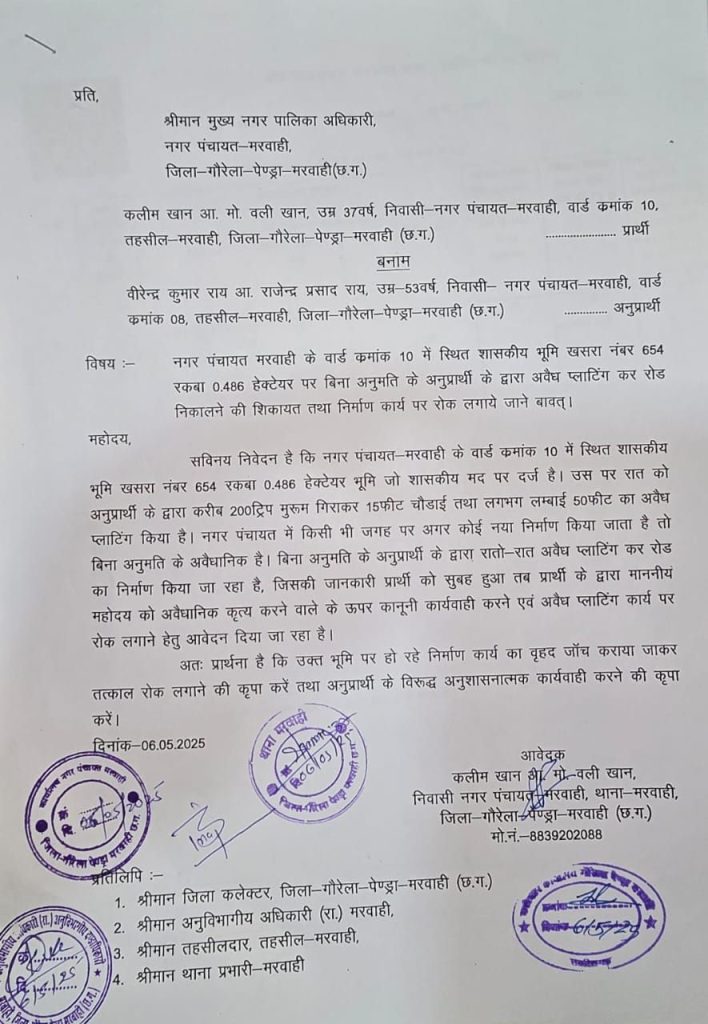 इस तरह का बल किसके संरक्षण में हो रहा है ये विचारणीय है । ऐसा एक वाक्य नगरपंचायत मरवाही के वार्ड क्रमांक 10 में स्थित शासकीय भूमि खसरा नंबर 654 रकबा नंबर 0.486 पर बिना अनुमति के *वीरेंद्र कुमार राय / राजेंद्र प्रसाद राय उम्र -53वर्ष निवासी नगर पंचायत मरवाही वार्ड क्रमांक 08 तहसील मरवाही द्वारा किया जा रहा है।*
