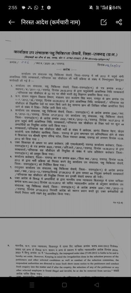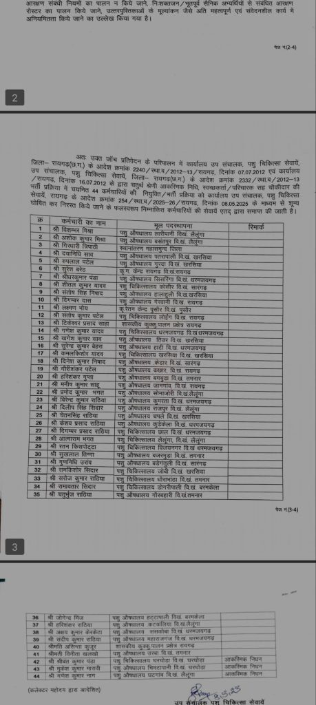 रायगढ़, 09 मई 2025/पशु चिकित्सा सेवा विभाग जिला रायगढ़ में वर्ष 2012 में चतुर्थ श्रेणी आकस्मिक निधि स्वच्छकर्ता/ परिचारक सह चौकीदार की भर्ती प्रक्रिया में अनियमितता की शिकायत पर गठित जांच समिति के प्रतिवेदन के परिपालन में उप संचालक, पशु चिकित्सा सेवायें, रायगढ़ ने 08 मई 2025 को आदेश जारी करते हुए पूरी भर्ती को शून्य घोषित किया और 44 कर्मचारियों की सेवायें समाप्त कर दी है।