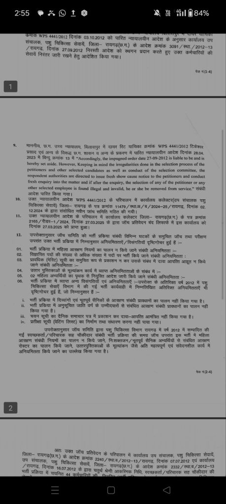 उपरोक्तानुसार जाँच समिति द्वारा पशु चिकित्सा विभाग रायगढ़ में वर्ष 2012 में सम्पादित की गई स्वच्छकर्ता/परिचारक सह चौकीदार संबंधी भर्ती प्रक्रिया की समग्र जॉच उपरांत इस भर्ती में महिला आरक्षण संबंधी नियमों का पालन न किये जाने, निःशक्तजन / भूतपूर्व सैनिक अभ्यर्थियों से संबंधित आरक्षण रोस्टर का पालन किये जाने, उत्तरपुस्तिकाओं के मूल्यांकन जैसे अति महत्वपूर्ण एवं संवेदनशील कार्य में अनियमितता किये जाने का उल्लेख किया गया है। जांच समिति के प्रतिवेदन के आधार पर उप संचालक पशु चिकित्सा सेवाएं रायगढ़ द्वारा उक्त 44 कर्मचारियों की सेवा समाप्ति के आदेश 8 मई 2025 को जारी कर दिया गया है।