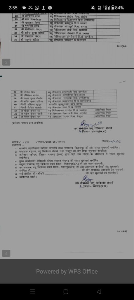 पशु पालन विभाग द्वारा जारी सूची में श्री विशम्भर मिश्रा-पशु औषधालय लारीपानी विखं. लैलूंगा, श्री अशोक कुमार मिश्रा- पशु औषधालय बसंतपुर वि.खं. लैलूंगा, श्री गिरधारी त्रिपाठी – स्थानांतरण महासमुन्द जिला, श्री दयानिधि साव-पशु औषधालय पतरापाली वि.खं. खरसिया, श्री रुपलाल पटेल -पशु औषधालय गुरदा वि.खं. खरसिया, श्री सुरेश बरेठ – कृ.ग. केन्द्र रायगढ वि.खं. रायगढ़, श्री श्रीधरकुमार पंडा – पशु औषधालय सिसरिंगा वि.खं. धरमजयगढ़, श्री शीतल कुमार यादव – पशु चिकित्सालय कोसीर वि.खं. सारंगढ़, श्री संतोष सिंह निषाद -पशु औषधालय हालाहुली वि.ख. खरसिया, श्री दिगम्बर दास – पशु औषधालय गेरवानी वि. ख. रायगढ़, श्री लक्ष्मण भोय – कृ . रेतन केन्द्र पुसौर वि.खं. पुसौर, श्री संतोष कुमार पटेल – पशु चिकित्सालय लोईंग वि.ख. रायगढ़, श्री टिकेश्वर प्रसाद साहा-शासकीय कुक्कुट पालन प्रक्षेत्र रायगढ़, श्री गणेश कुमार यादव – पशु चिकित्सालय धरमजयगढ़ वि.खं. धरमजयगढ़, श्री खगेश कुमार साव -पशु औषधालय तिउर वि.खं. खरसिया, श्री सुरेन्द्र कुमार बेहरा – पशु औषधालय हाटी वि.खं. धरमजयगढ़, श्री कमल किशोर यादव – पशु चिकित्सालय,वि. ख. खरसिया, श्री दिनेश कुमार निषाद – पशु औषधालय, केडार वि. ख. सारंगढ़, श्री गौरीशंकर पटेल – पशु औषधालय कछार, वि.खं. रायगढ़, श्री हरिशंकर गुप्ता – पशु औषधालय बगबुडा वि.खं. तमनार, श्री मनीष कुमार साहू – पशु औषधालय जामगांव, वि.खं. रायगढ़, श्री प्रमोद कुमार भगत – पशु औषधालय सोनाजोरी वि.ख. लैलूंगा, श्री बिरेन्द्र कुमार राठिया -पशु औषधालय कुमरता वि.खं. धरमजयगढ़, श्री दिलीप सिंह सिदार – पशु औषधालय राजपुर वि.खं. लैलूंगा, श्री चेतनसिंह राठिया – पशु औषधालय चपले वि.खं. खरसिया, श्री केशव प्रसाद राठिया – पशु औषधालय कुडेकेला वि.खं. धरमजयगढ़,
