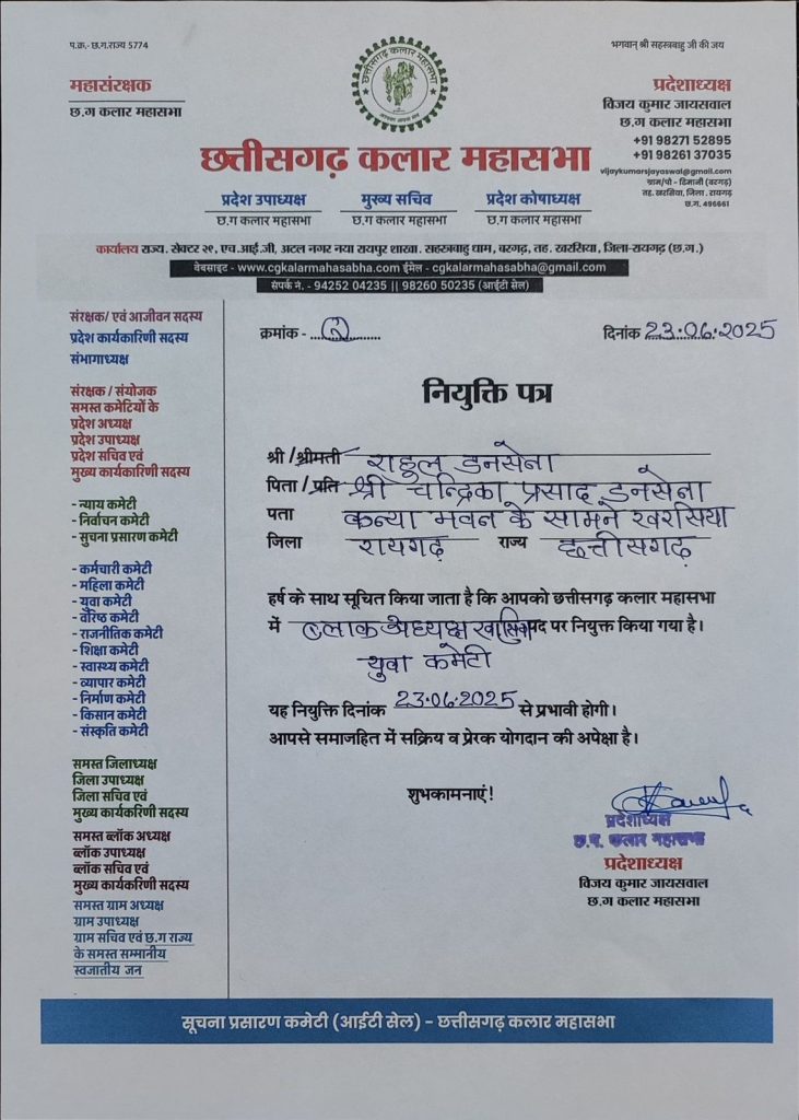 यह नियुक्ति पत्र छत्तीसगढ़ कलार महासभा के प्रदेशाध्यक्ष विजय कुमार जायसवाल द्वारा जारी किया गया है। महासभा ने अपने पत्र में राहुल डनसेना से अपेक्षा जताई है कि वे समाजहित में पूरी निष्ठा और सक्रियता से कार्य करेंगे और युवाओं को समाजसेवा के लिए प्रेरित करेंगे।