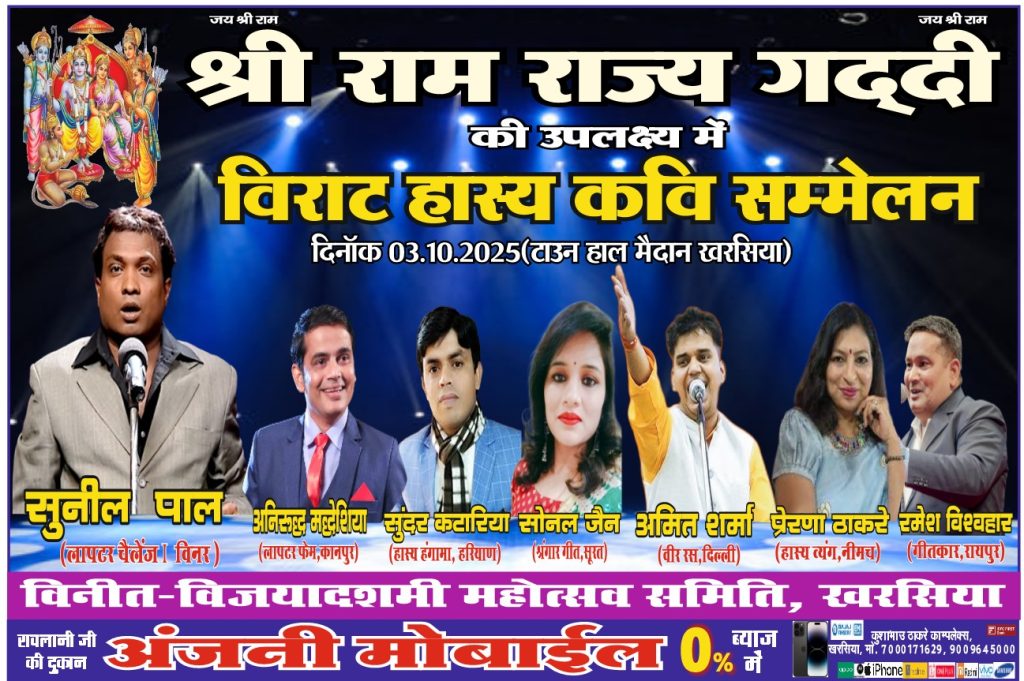 आज शाम को छत्तीसगढ़ी नाइट का आयोजन रोटरी क्लब के तत्वावधान में किया जाएगा, जिसमें प्रमुख सिंगर राजन कर अपनी मधुर आवाज़ से दर्शकों का मनोरंजन करेंगे। रात्रि में रावण दहन के भव्य आयोजन के बाद, कल राम राज गद्दी में आयोजित होगा विराट हास्य कवि सम्मेलन। इस हास्य महोत्सव में लाफ्टर चैलेंज विजेता सुनील पाल मुख्य आकर्षण होंगे। इसके अलावा, कानपुर, हरियाणा, सूरत, दिल्ली, नीमच और रायपुर से भी अनेक प्रतिभाशाली कलाकारों की उपस्थिति कार्यक्रम को और भी रंगीन बनाएगी।