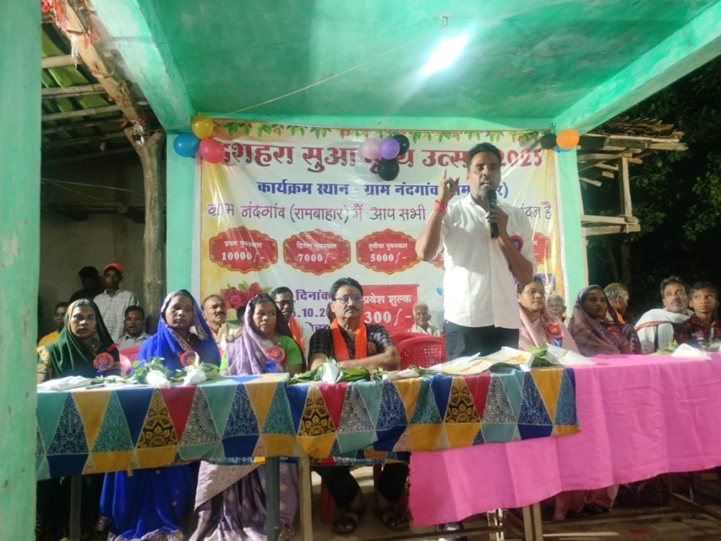 नंदगांव (राम बहार) – 5 अक्टूबर 2025 को नंदगांव में दशहरा मुआ नृत्य उत्सव का आयोजन बड़े ही धूमधाम से किया गया। इस अवसर पर क्षेत्रभर से आए मुआ नृत्य दलों ने अपनी अद्भुत प्रस्तुतियों से दर्शकों का मन मोह लिया।