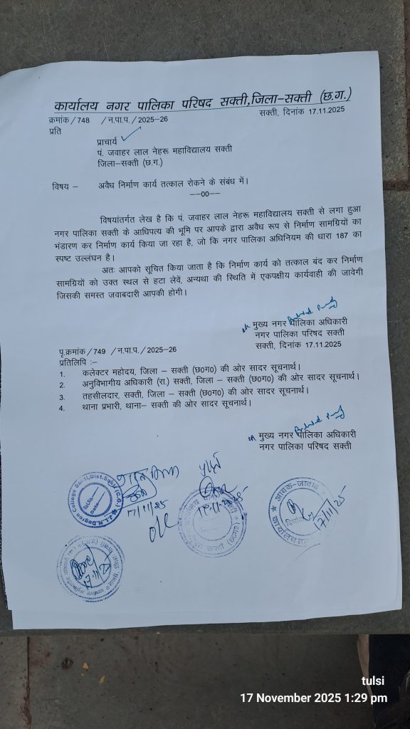 सक्ती, 17 नवंबर 2025।नगर पालिका परिषद सक्ती ने पं. जवाहर लाल नेहरू महाविद्यालय सक्ती के समीप स्थित नगरपालिका की भूमि पर हो रहे कथित अवैध निर्माण कार्य को तत्काल प्रभाव से रोक दिया है। इस संबंध में नगरपालिका प्रशासन ने महाविद्यालय प्राचार्य को नोटिस जारी कर निर्माण बंद करने के निर्देश दिए हैं।
