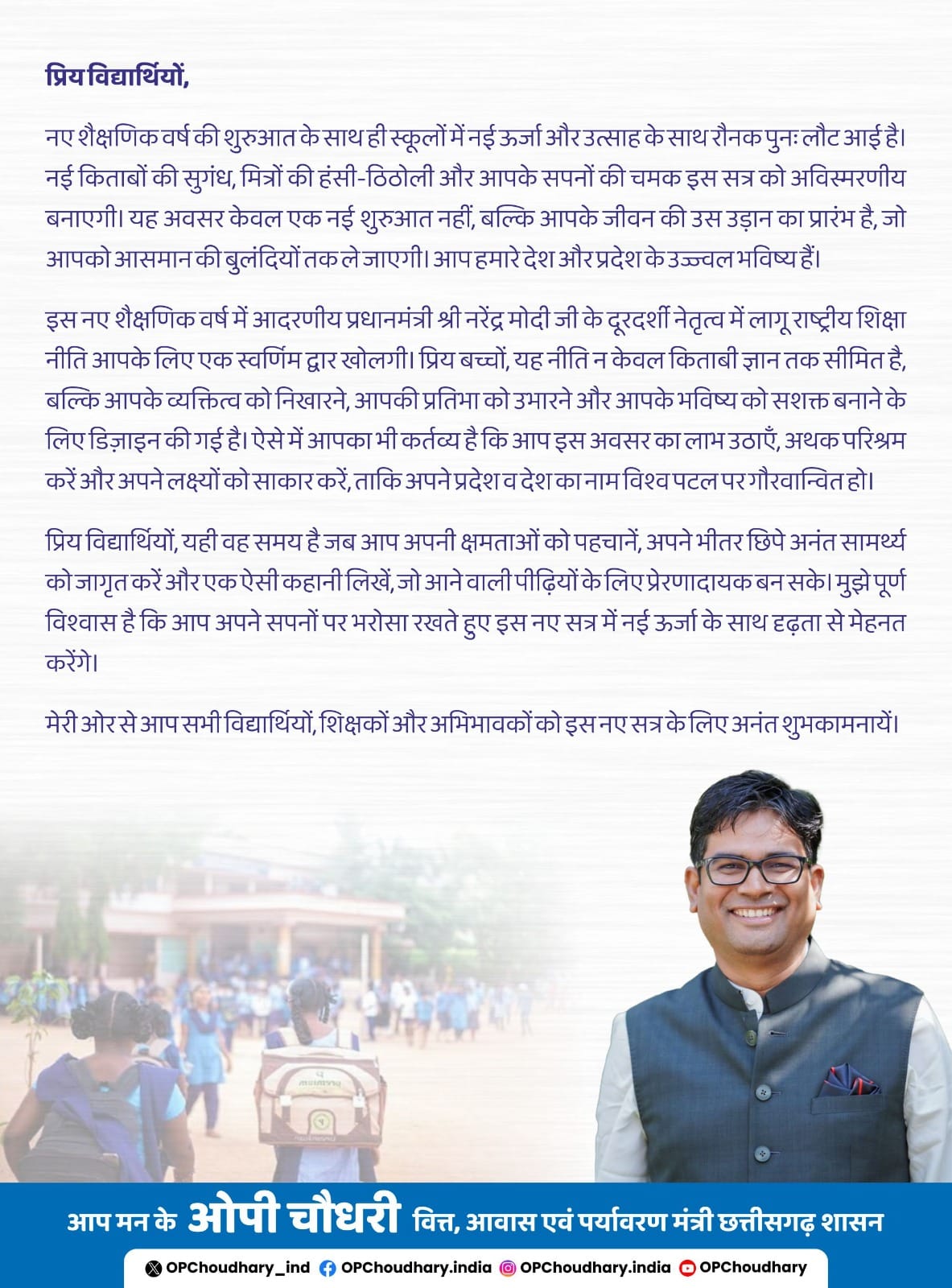 वित्त मंत्री ओपी चौधरी – प्रिय विद्यार्थियों,नए शैक्षणिक वर्ष की शुरुआत के साथ ही स्कूलों में नई ऊर्जा और उत्साह…