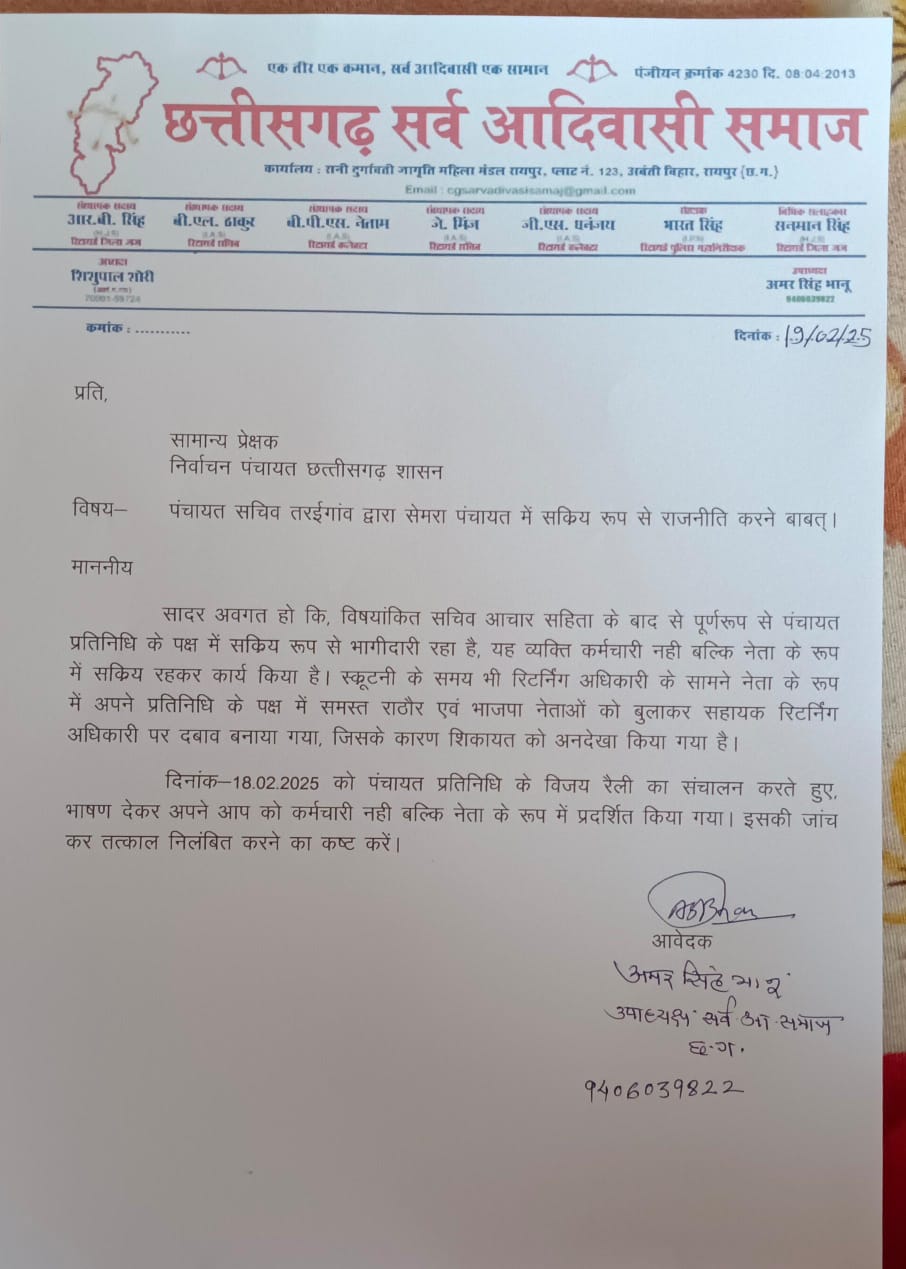 ग्राम पंचायत सचिव कर रहा चुनाव प्रचार सरकारी कर्मचारी की लिखित शिकायत जाँच का आदेश आवश्यक कार्यवाही की मांग। गौरेला…